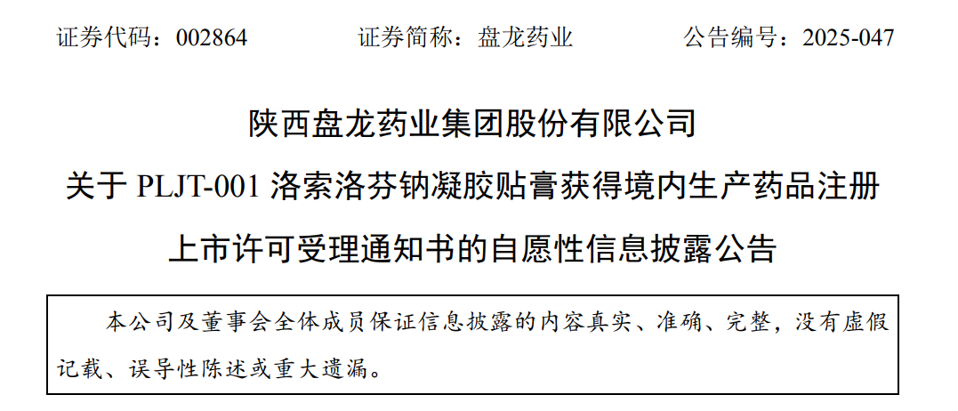 盤龍藥業PLJT-001洛索洛芬鈉凝膠貼膏上市申請獲受理,鎮痛新藥研發(fā)再提速